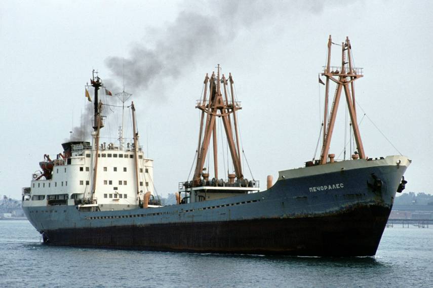 Как раз грузилось в порту балансами (кажется так назывались небольшие брёвна для целлюлозной промышленности) судно «Печоралес»...