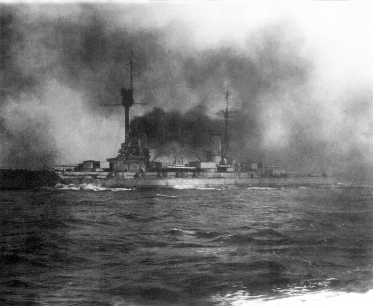 «Фридрих дер Гроссе» — линкор класса «Кайзер», вероятно, во время капитуляции в 1918 году. Корабли, работавшие на угле, создавали дым из дымовых труб, что могло стать помехой в бою. Во время сражения у Доггер-банки британцы надеялись занять позицию к востоку, которая отрезала бы немцев от портов базирования и дала бы Королевскому флоту преимущество в виде света и ветра, чтобы рассеять дым из дымовых труб.