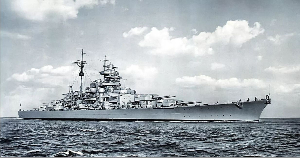 Немецкий линкор «Бисмарк» в начале своего первого и последнего похода. Германская военно-морская доктрина заключалась в уничтожении британских судов подводными лодками и мощными надводными кораблями, такими как «Бисмарк». Если бы они потпили достаточно много судов, Британия была бы вынуждена капитулировать из-за голода.