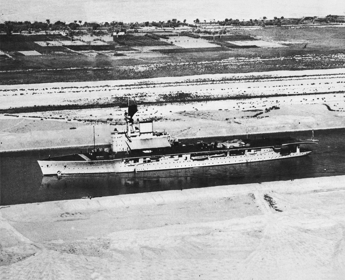 HMS Hermes в 1937 году проходит через Суэцкий канал. Это был первый корабль, спроектированный с нуля как авианосец для Королевского флота.