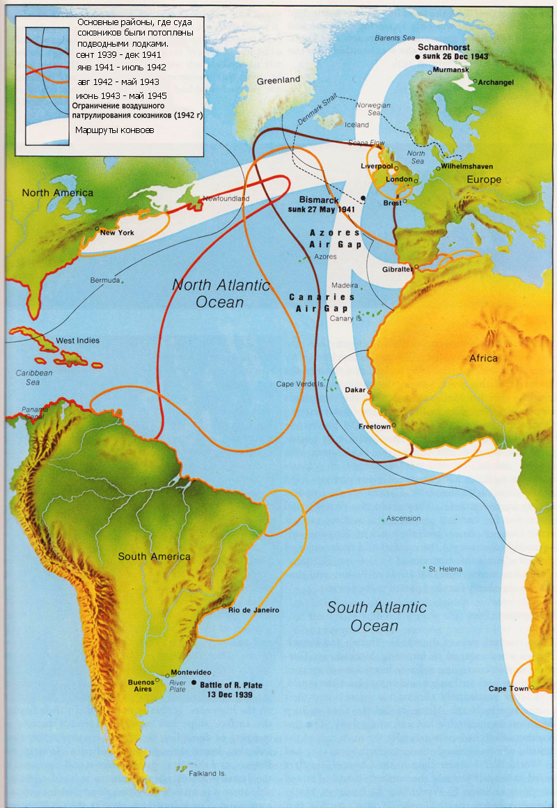 Битва за Атлантику – так называлась англо-американская борьба за сохранение судоходных путей в Великобританию открытыми. Угроза со стороны подводных лодок, вероятно, была самой серьёзной угрозой для Великобритании во время войны. Если бы немцы смогли развернуть больше подводных лодок в 1940 и 1941 годах, ход Второй мировой войны мог бы быть совершенно иным.