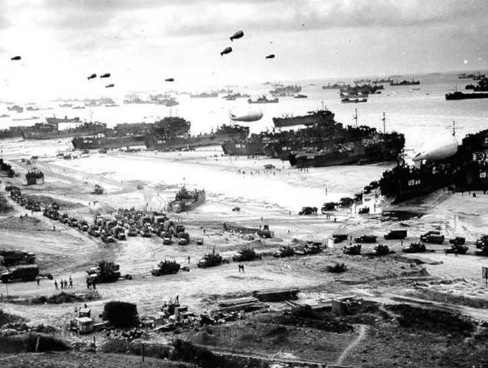 Под защитой аэростатов заграждения и артиллерии флота союзные войска высаживаются с LCT на берег в Нормандии.