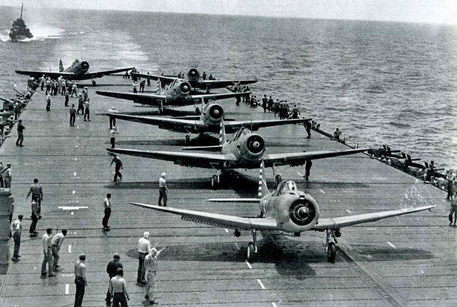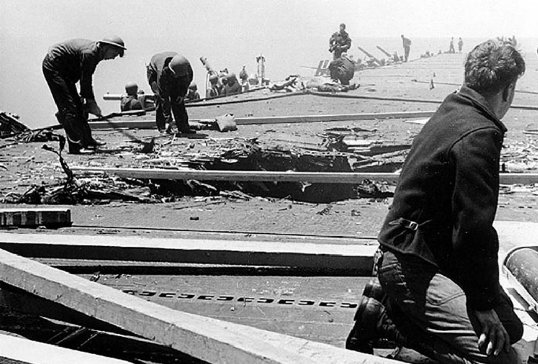 Команды по борьбе за живучесть работают на полётной палубе авианосца «Йорктаун» после японских атак 4 июня 1942 года во время битвы за Мидуэй. Американские авианосцы не имели бронированных полётных палуб, что делало их уязвимыми для воздушных атак, хотя это и снижало вес и, следовательно, увеличивало скорость.
