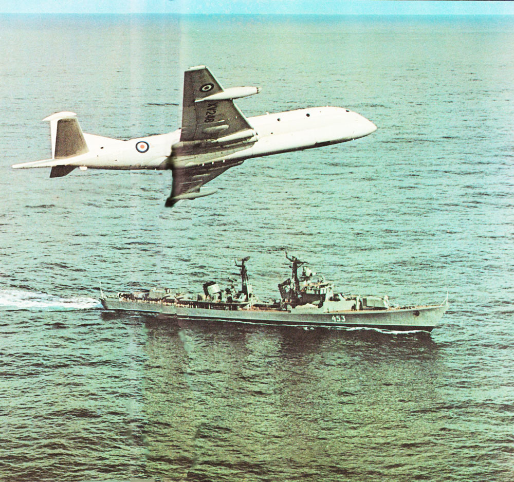 Корабль ВВС Великобритании «Нимрод» совершает вираж влево, облетая советский эсминец класса «Котлин» вблизи нефтяной платформы в Северном море в апреле 1975 года. Россия заинтересована как в экономическом, так и в стратегическом плане в освоении нефтяных месторождений Северного моря, и защита этих ресурсов стала важным приоритетом для НАТО, особенно для Великобритании и Норвегии.