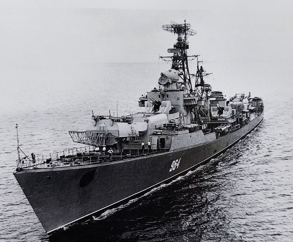 Российский эсминец с управляемым ракетным оружием проекта «Krupny». Этот тип корабля обладает артиллерийской и ракетной мощью, значительно превосходящей эсминцы времён Второй мировой войны. Он вооружён комплексом ракет класса «земля-земля» и «земля-воздух», а также противолодочными ракетными установками, торпедными аппаратами и лёгкими зенитными орудиями с радиолокационным управлением.