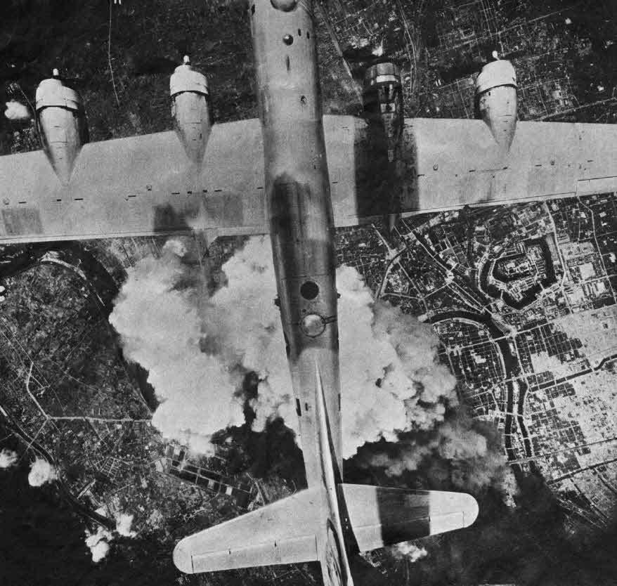 B-29 ВВС США над целью. Хотя бомбовая нагрузка была меньше, чем у «Ланкастера» ВВС Великобритании, B-29 имел герметичный кокпит, что позволило экипажу вывести его за пределы досягаемости зенитного огня с земли.