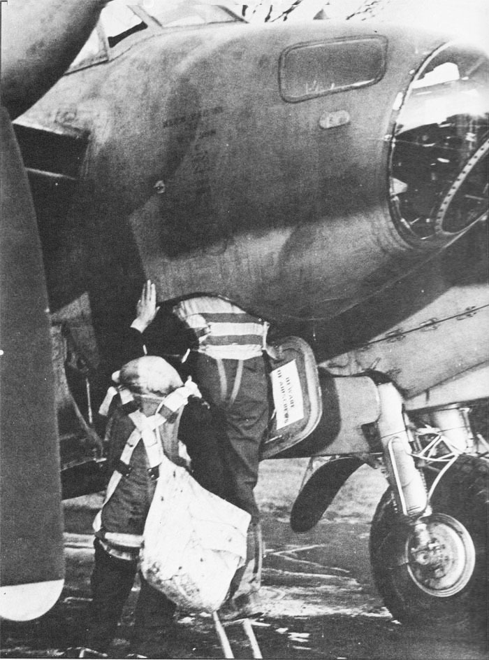 Экипаж бомбардировщика ВВС США пробирается через тесный люк в кабину пилота и к месту стрелка. Американцы сосредоточились на дневных налётах, которые, несмотря на значительные затраты, были более точными. Они также пытались поражать важные экономические цели, такие как нефтяные и промышленные объекты.
