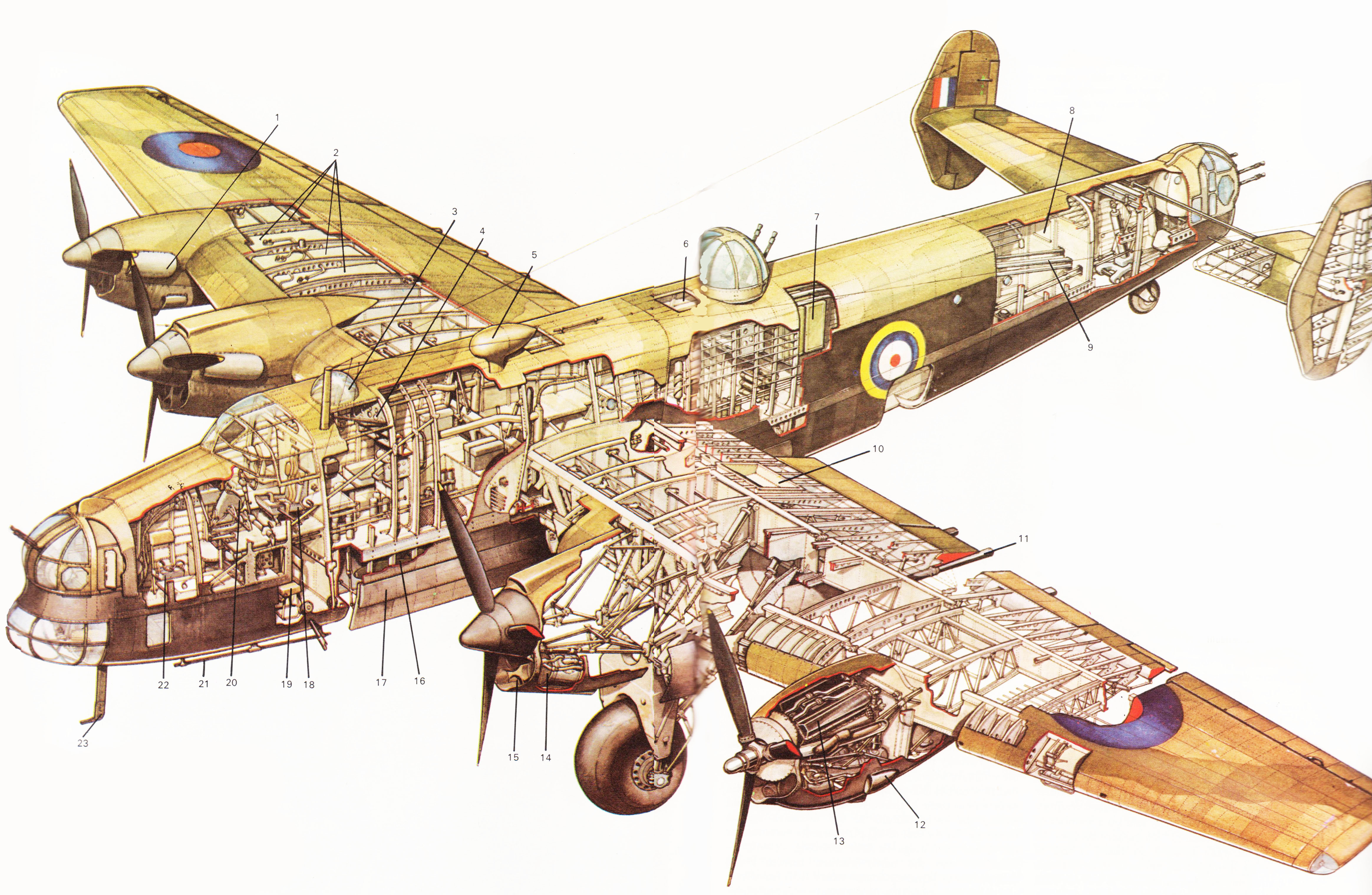 1. Защитный экран выхлопной системы 2. Топливные баки 3. Астрокупол 4. Приборная панель механика 5. Петля DIF 6. Задний аварийный люк 7. Погреба с боеприпасами 8. Дверь в хвостовую турель 9. Траки для боеприпасов 10. Укладка в грязную тару 11. Трубы слива топлива 12. Воздухозаборник карбюратора 13. Двигатель Merlin XX 14. Радиатор системы охлаждения 15. Радиатор системы охлаждения 16. Бомбоотсек 17. Створки бомболюка 18. Кресло пилота 19. Кресло радиста 20. Органы управления пилота 21. Дипольная антенна 22. Место штурмана 23. Напорная головка
