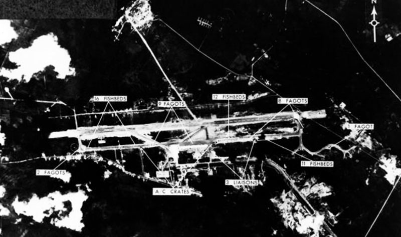 Аэродром на Кубе с истребителями советского производства на пунктах рассредоточения вдоль главной полосы.