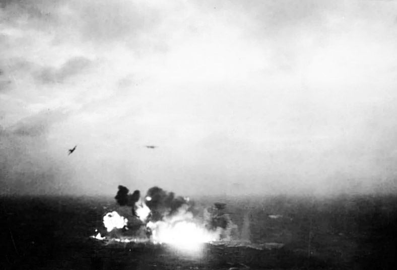Прибрежный танкер взрывается после попадания ракет Mosquito.