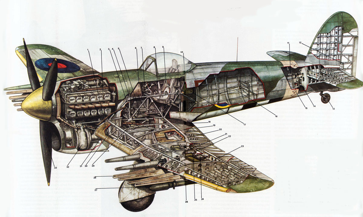 1 Топливный бак передней кромки 2 Двигатель Napier Sabre II 3 Ребро жесткости гидравлического резервуара 4 Педали руля направления 5 Подпятники 6 Ребро маслобака 7 Приборная панель 18 Пушка управления двигателем (четыре) 9 Кресло пилота 10 Кислородный баллон 11 Весовая балансировка руля высоты 12 Рама руля направления (четыре на каждом крыле) 13 Убирающееся хвостовое колесо 14 Управление рулем высоты 15 Накладка хвостового шарнира 16 Тросы управления 17 Радиооборудование 18 Нескользящая дорожка 19 Топливный бак 20 Внутренняя нервюра крыла 21 Промежуточное крыло 22 Заднее крепление 23 Внешняя ребро жесткости крыла 24 20-мм пушка Hispano Mk 25 Ящик с боеприпасами 26 Домкрат закрылков 27 Неуправляемые ракеты 601b UP HE 28 Направляющие ракет 29 Воздуховод обогрева орудийного отсека 30 Нервюра корня крыла 31 Створка радиатора Домкрат 32 Радиатор 33 Трехлопастной винт D H