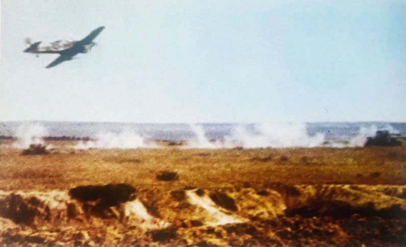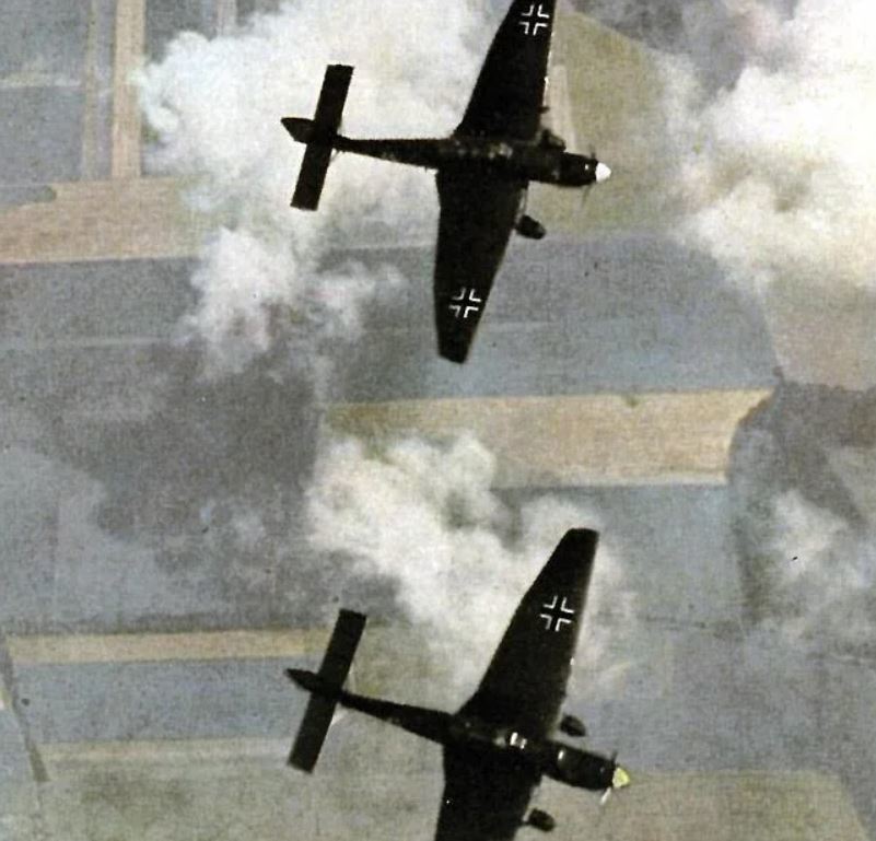 Junkers Ju-87, известный союзникам и странам Оси как «Stuka» (аббревиатура от «Пикирующий бомбардировщик»), начинает разбег, предшествующий пикированию на цель. Бомбардировка с пикирования позволяла бомбардировщикам очень точно поражать небольшие цели, а немцам — уничтожать транспортные средства, командные пункты и даже огневые позиции перед наземной атакой — это было важной частью их тактики блицкрига.