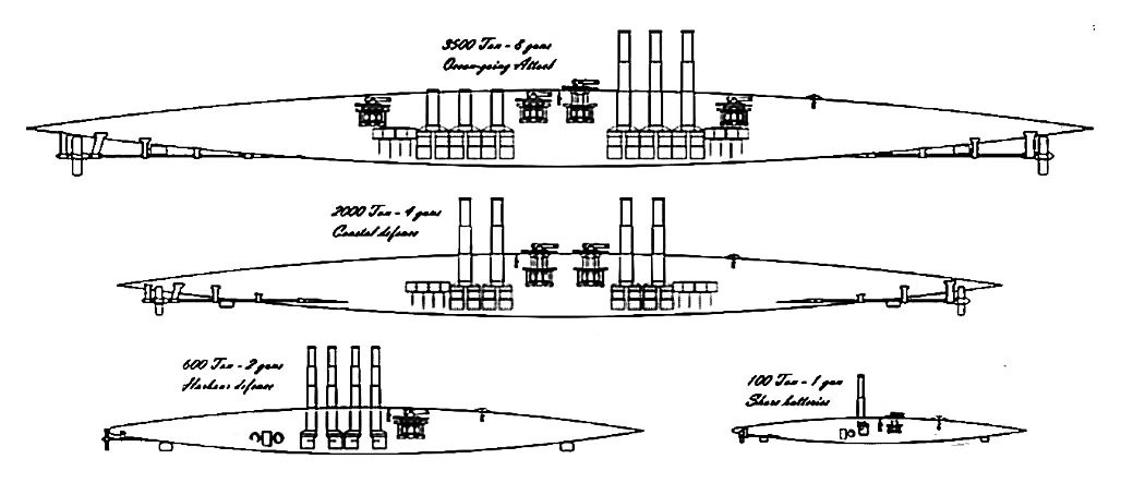 ▶ «Намного меньшие по размеру батареи, способные просто занять и удерживать позицию, с одной большой пушкой, были бы хороши для действий на мелководье, против береговых сооружений, а также полезны при обороне гавани».