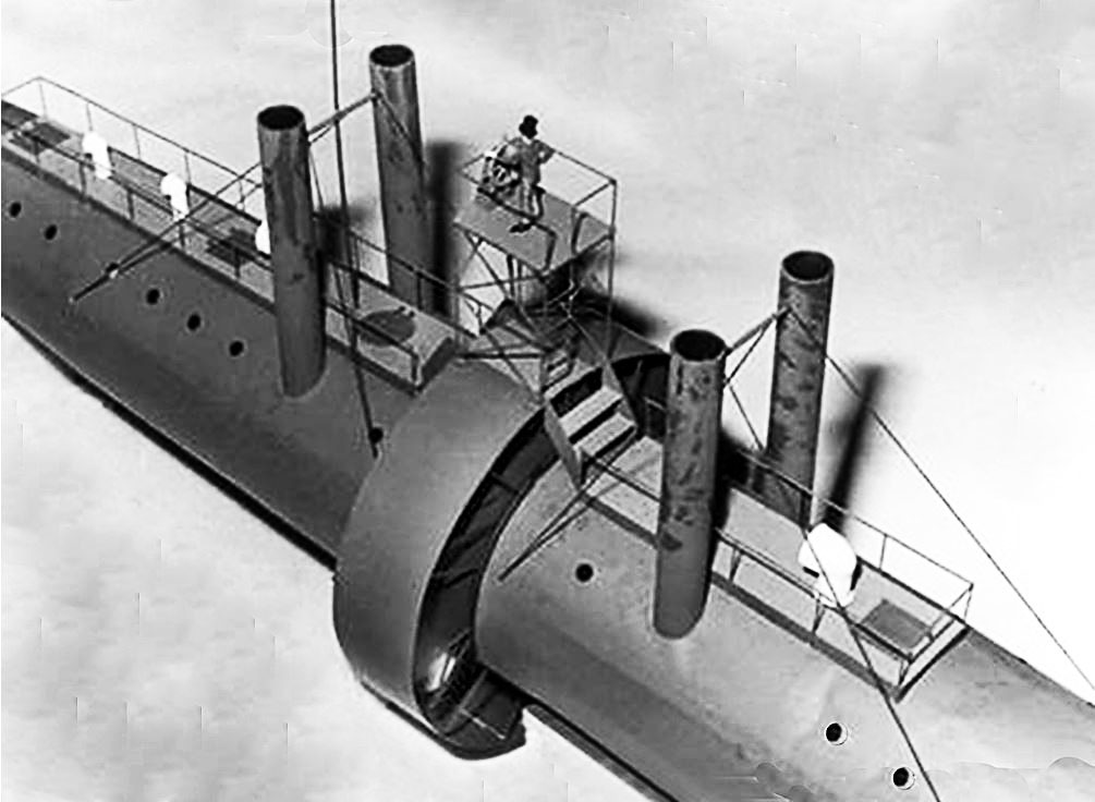 ▶ Водоизмещением 3500 тонн, обшитый железными листами толщиной от 31 до 38 мм, «вооруженный шестью или восемью тяжелыми орудиями». Такой корабль сможет «плавать вокруг Британских островов совершенно безнаказанно», «наносить ущерб их торговле и топить столько военных кораблей, сколько они смогут выставить против нас». У него двухлопастные гребные винты в носовой и кормовой оконечностях.