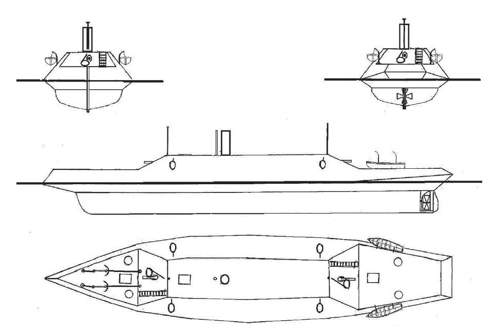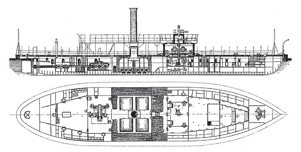 Водоизмещение 648 т. 62,9 × 11,58 × 5,12 м. Одна горизонтальная ПМ. Ск. 8 уз. Броня: корпус и каземат — 76 мм. Арт. одно 110-фнт и одно 68-фнт гладкоствольные дульнозарядные пушки. Экипаж 100 чел.