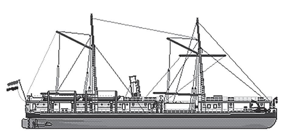Корпус железный. Водоизмещение 2540 т. 64,4 × 13,6 × 4,42 м.