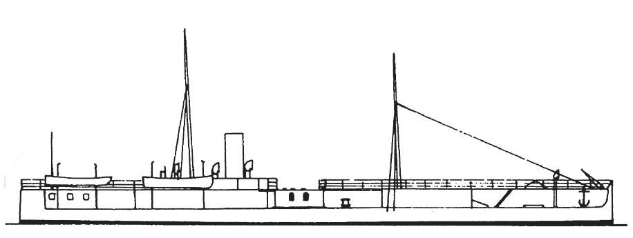 Водоизмещение 1560 (полное 1704 т). Корпус железный. 56,69 × 13,41 × 3,2 м. Броня (кованое железо): пояс 152 мм, в оконечностях 114 и 102 мм, палуба 25 мм, кожух дымовой трубы 114 мм, бруствер 203 мм, башня 229–203 мм. ПМ 2 × 375 л. с., 4 котла, 2 вала, скорость до 9,5.