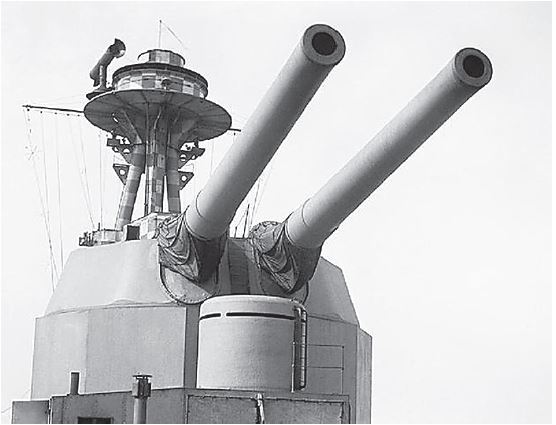 Два орудия находились в «ограниченно подвижной» башне, способной вести огонь только вперёд, в секторе 60 градусов по курсу корабля.