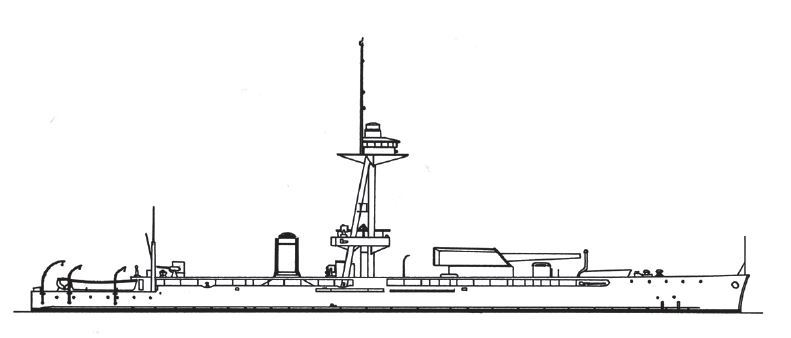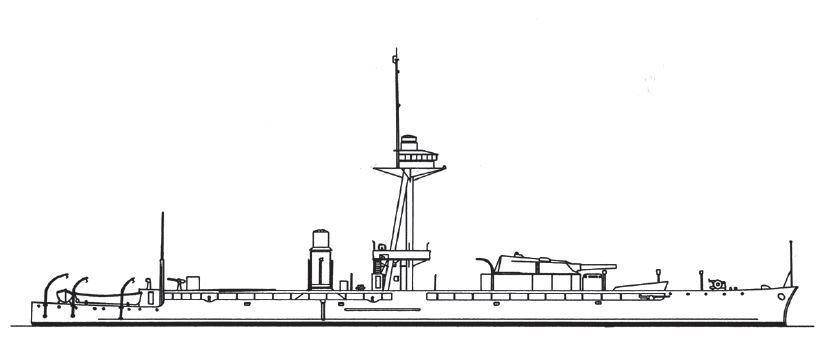 Водоизмещение 703 т. 43 × 9,5 × 2,15 м. 190 л. с. 21 т угля. 6 узл. Экипаж 60 чел. 1—160-мм, 4—120-мм.