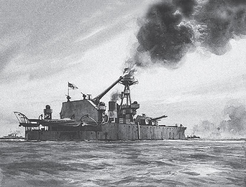 «Lord Clive» обстреливает германские укрепления на бельгийском побережье из 18-дм (406-мм) орудия, изготовленного для линейного крейсера «Furies»