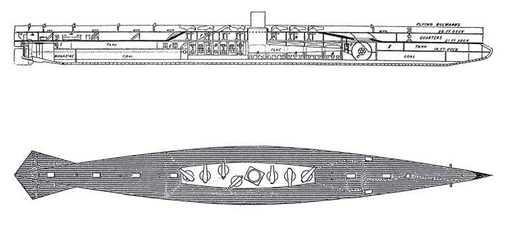 Расчёты же орудий (за исключением наводчиков, по одному на каждое орудие) находятся в бронированных казематах, частично выступающих из палубы. Артиллеристы будут заряжать орудия через люки в этих казематах. Дула орудий направят в люки, в специальные цилиндры, куда подаются снаряды, а досылатели с паровыми приводами втолкнут снаряды в стволы. Эта схема обещала существенно повысить скорострельность.