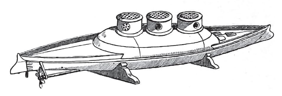 По проекту, на палубе стояли две вращающиеся башни с одной пушкой крупного калибра в каждой. Кроме того, погрузившись настолько, чтобы из воды выступал только смотровой колпак рулевого, этот корабль мог атаковать вражеский корабль шестовой миной либо тараном.