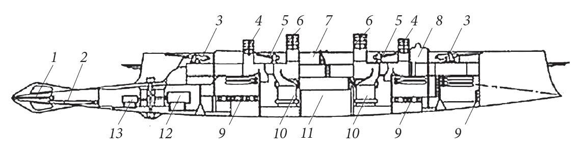 1 — вертикальный руль; 2 — торпедные аппараты в оконечностях; 3 — 152-мм орудие; 4 — вентиляционные трубы; 5 — 102-мм орудие; 6 — дымовые трубы; 7 — жилые помещения; 8 — рубка управления; 9 — траверзные торпедные аппараты; 10 — котлы; 11 — тепловой аккумулятор; 12 — главная турбина; 13 — турбина экономического хода