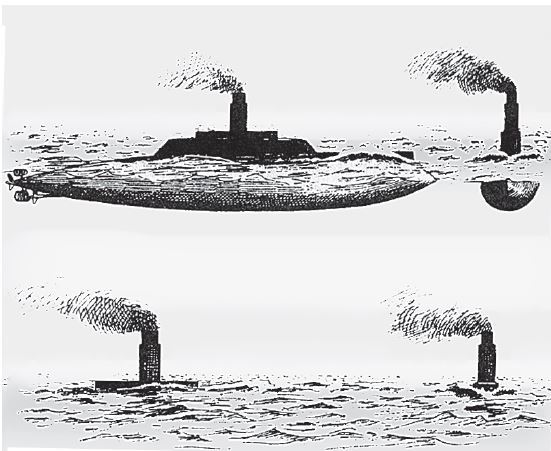 Главная идея изобретателя была такова: Подводное судно очень уязвимо, когда оно находится на поверхности. Во избежание этого дефекта в нашем судне, мы уменьшили в нём запас плавучести, доводя последний... до 9 % от водоизмещения, и для того, чтобы при этом судно имело хорошие морские качества, мы придали надстройке узкую и удлиненную форму и достаточную высоту [до 2 м].