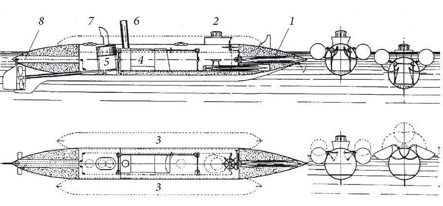 1 — торпедный аппарат, под ним — запасная торпеда; 2 — башенка рулевого; 3 — поплавки; 4 — паровой котел; 5 — паровая машина; 6 — дымовая труба; 7 — вентиляционная труба; 8 — рулевая тяга. Пунктиром показан поднятый поплавок
