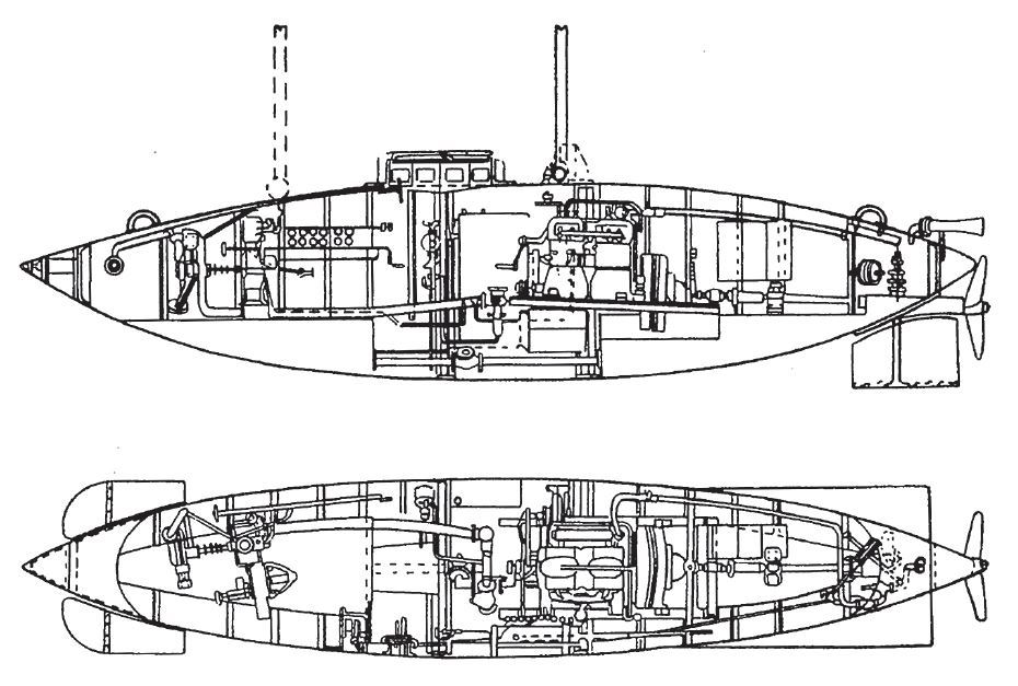Но чтобы выйти на внешний рейд и поставить там 4 якорные мины заграждения, как планировал М. П. Налётов, требовался мотор внутреннего сгорания. Для постановки мин вниз, под корпус, служила специальная металлическая ёмкость, размещенная в середине корпуса.