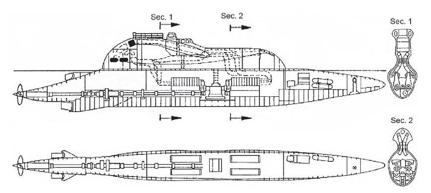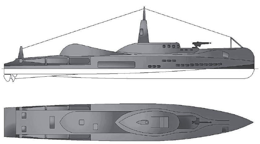 Силовая установка: дизельный мотор для надводного хода (наибольшая скорость по проекту 30 узлов), электромотор для движения под водой (полный ход 9 узлов, экономический — 4 узла). Корпус стальной, глубина погружения не более 15 метров, лишь бы спрятаться от вражеских наблюдателей.