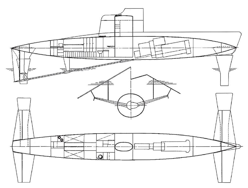 При необходимости всплытия воду вытеснит сжатый воздух из баллонов высокого давления. Конфигурация корпуса этого интересного судна напоминает первые торпеды Уайтхеда.