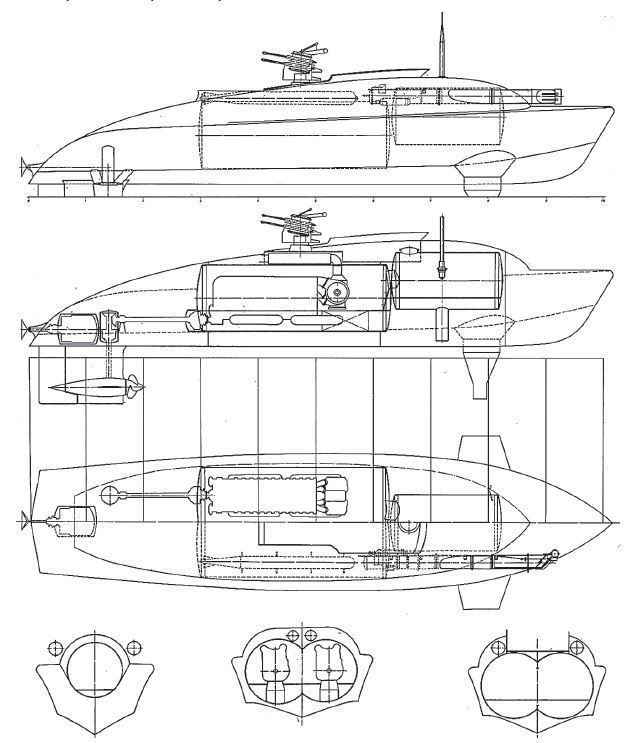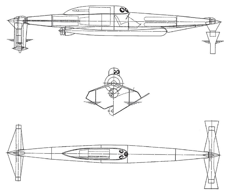 Но в этой книге мне интересны проекты полуподводных торпедных катеров с крыльями для надводного хода, оставшиеся нереализованными. Все они имели балластные цистерны для погружения и всплытия.