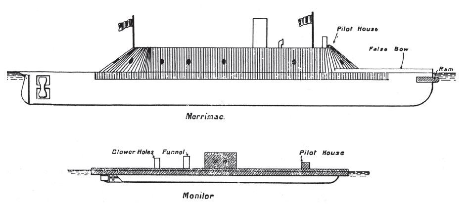 Когда конфедераты захватили военно-морскую базу Госпорт в районе Норфолка, в их руки попали 195 орудий крупного калибра и свыше 250 мелких. Кроме того, им достался полузатопленный паровой винтовой фрегат «Merrimack» (4636 т; 40 тяжёлых орудий), спущенный на воду в 1855 г. Уходя из Госпорта, федералы подожгли корабль и затопили его возле причальной стенки. Вода погасила пожар, поэтому корпус, пушки, котлы, и машины уцелели.