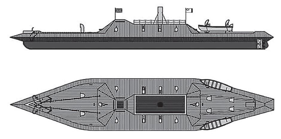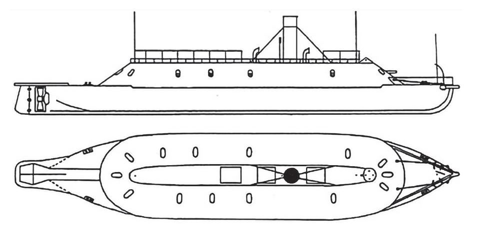 Джон Портер, как и Джеймс Идс, превращал в броненосцы гражданские паровые суда, а если строил их с нуля, то самой простой формы: плоское днище, прямолинейные скулы. Это упрощало и удешевляло постройку, так как судостроители Юга имели значительный опыт строительства плоскодонных речных и каботажных пароходов.